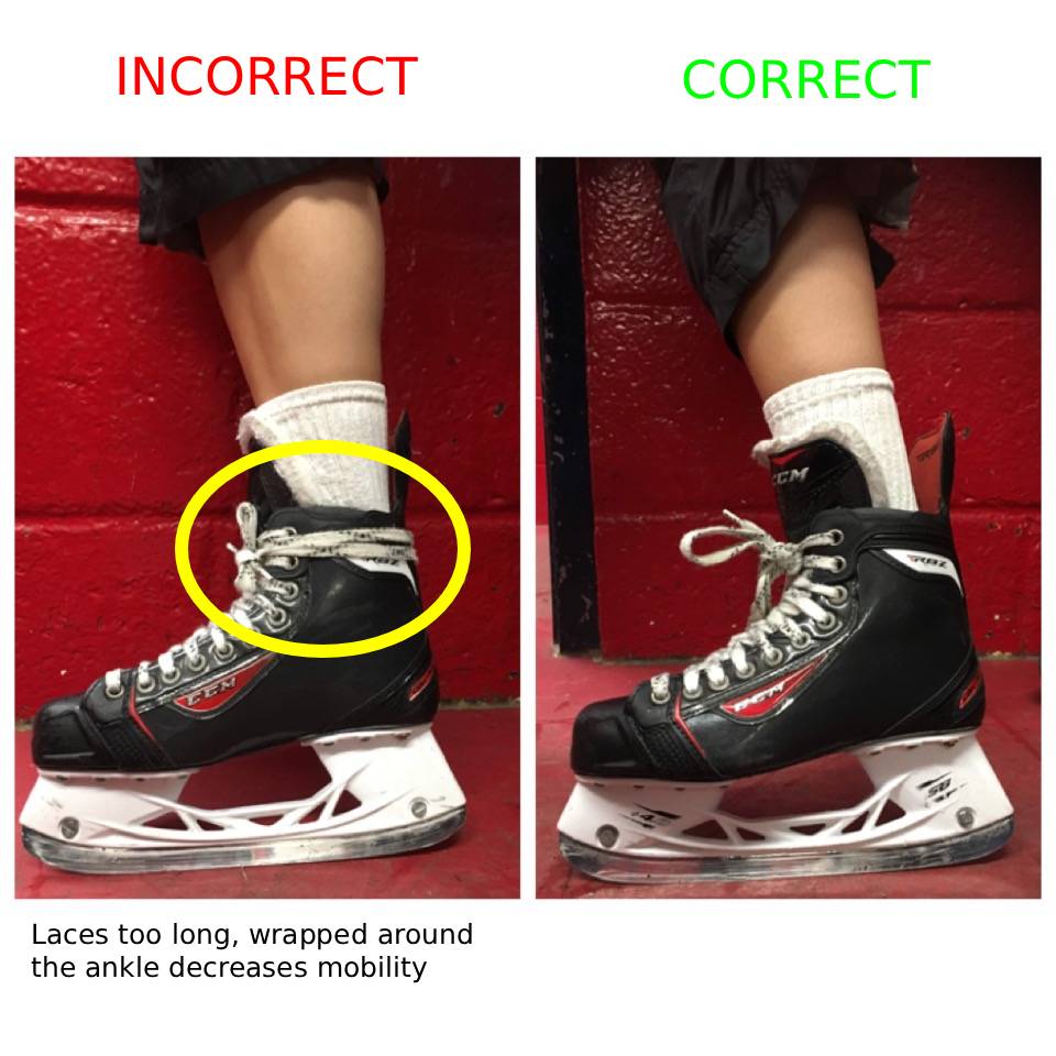 6. Once you have reached the top eyelets (after pulling tightly after each set), tie the skate like you would a running shoe with no slack.  If the laces are a little long, do a double knot.  Do not wrap the laces around the boot as this negatively impacts stride mobility.  If the laces can reach the ice after a double knot, the laces are too long. See above example.